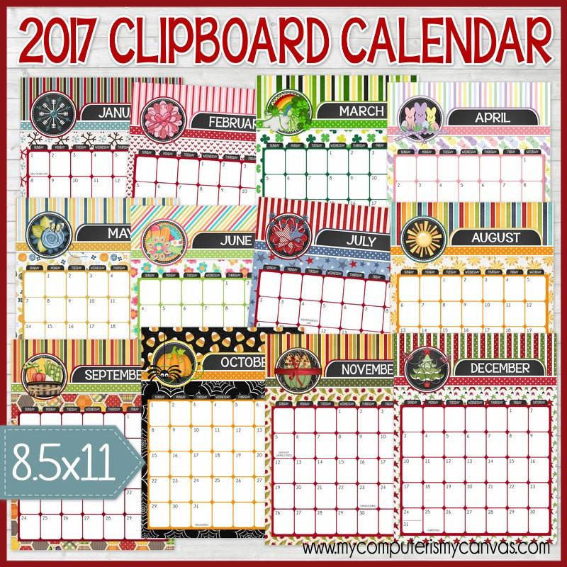Need a cute desk, wall or kitchen calendar for 2017? I display mine on a clipboard in my kitchen and love changing it out from month to month! You can also print and spiral bind at the top for a cute flip calendar - the file comes with a front and back cover, would make a great gift! The calendar is full color and festive!