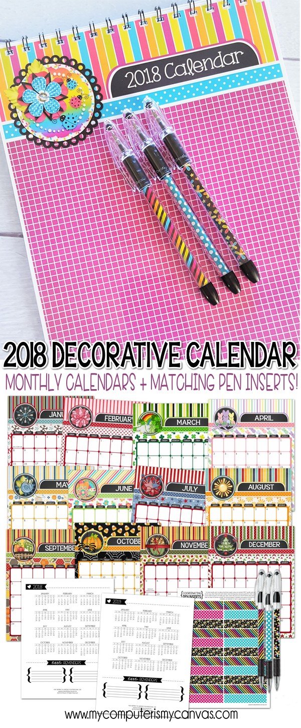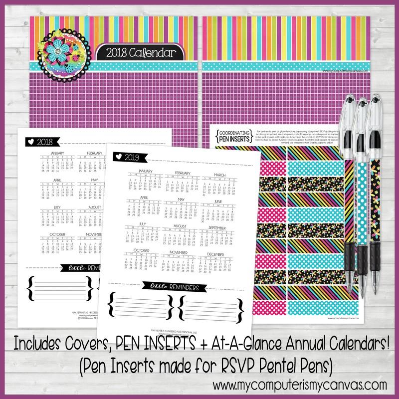 INCLUDED IN THIS LISTING: You will receive a 17 page high-quality PDF File that contain creatively themed 8.5 x 11 monthly calendar pages (Jan-Dec), portrait style. It also includes front and back covers - great if you'd like to spiral bind your calendar along the top. Also included are 2018 & 2019 Annual At-a-Glance Calendars for reference + matching pen inserts for RSVP Pentel Pens. This calendar includes all major US Holidays, plus a few others that we all love to look forward to.
