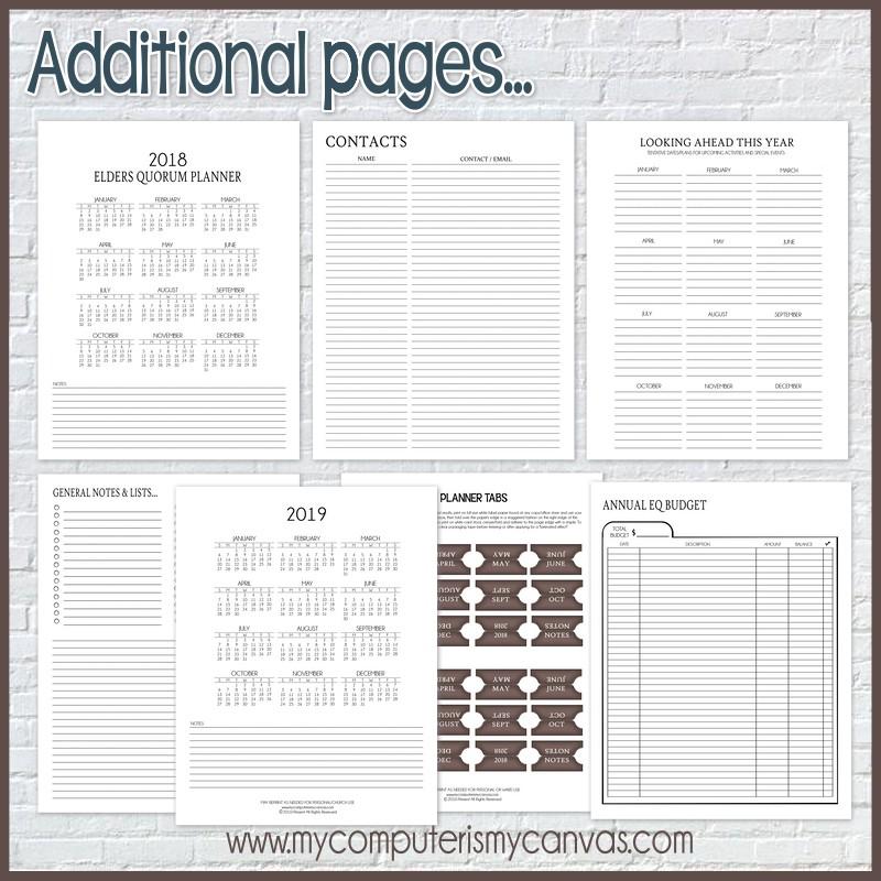 NOTE: My hubby was the EQ Pres and is now the new one as well. He thinks the planner will be fine for now. His initial opinion is there will be few if any changes to the current planner, but more likely some additions. If he has me design any new pages - I'll set the website to send them out automatically to anyone who has bought the planner. :) Then, when I do the 2019's (usually Sept) - I'll incorporate any little changes to titles/labels that he needs, etc.
