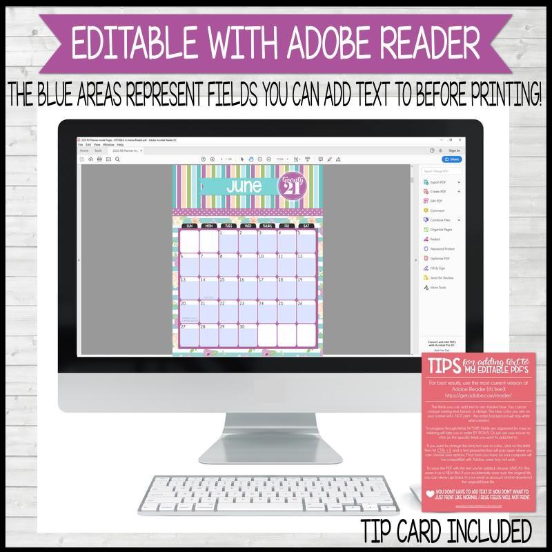 EDITABLE (using Adobe Reader): Pre-set fields are already programmed for you, simply open the PDF with the latest version of Adobe Reader (which is free) and you can add birthdays, events, etc before printing. A tip sheet is included to help you get started with the basics! Existing text, design and layout cannot be changed.