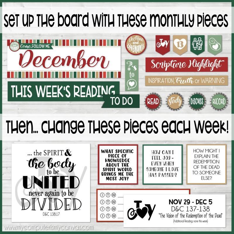 CHANGES FOR 2021: If you've used my board printables in the past... here are some fun changes: 1) "Weekly Study Icon" represents a revelation, warning or counsel found within the text of the reading assignment. 2) "Icon Pennants" to help remind you of previous lessons and a peek into what's coming up - great little review/reminder that stays up all month! 3) Instead of "just" inspiring words/phrases... this time you can pick 4 things to highlight - an inspiration, a warning or a truth - just fill in the bubble to label each one you list!