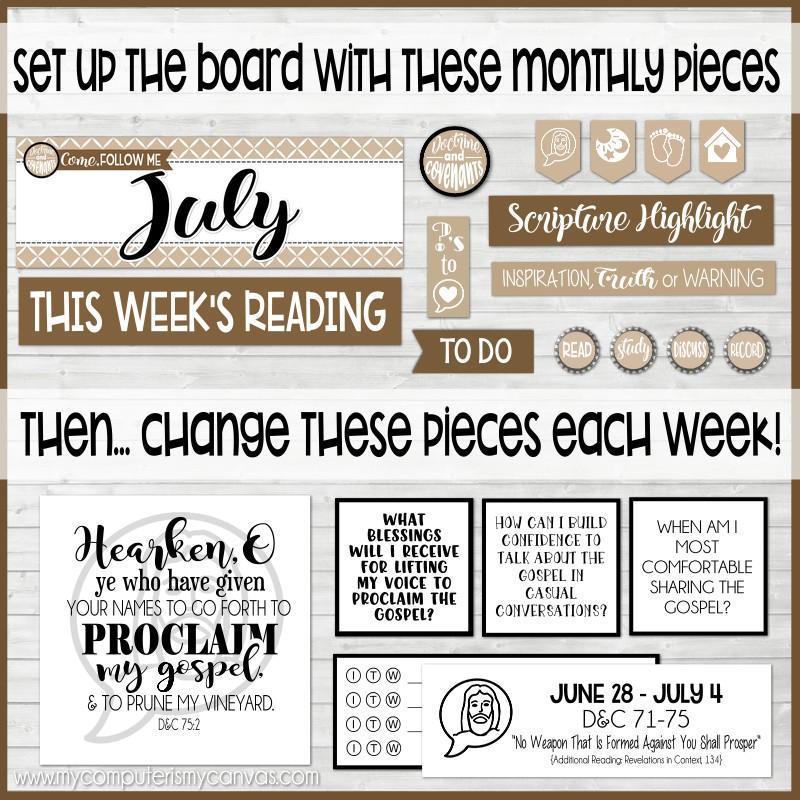 If you are looking for a fun, visual way to display and remember Come, Follow Me each week - look no further! This bulletin board kit printable is a quick, easy and informative way to keep your family on track with the reading schedule... AND with a special weekly icon, a verse highlight and 3 thoughtful questions - it can also help jump start your family discussion!