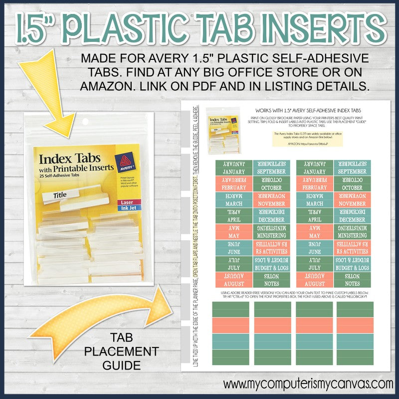 HOW TO PRINT & ASSEMBLE: Print your planner on regular white paper and choose "double sided printing". All inside pages are black and white only (which makes printing much less expense). For the covers, print front and back for each planner you make. The covers are designed for "borderless" printing, so if you are printing at home - select "photo printing" on your print properties and choose 8.5x11 borderless in your print properties if available (not all printers can print borderless). For most vivid color results, use any type of glossy paper. Laminate covers before binding to increase durability. Printing your covers can also be done at a copy shop. Then, either spiral bind or punch and store in a 3-ring binder (1" spines now included).