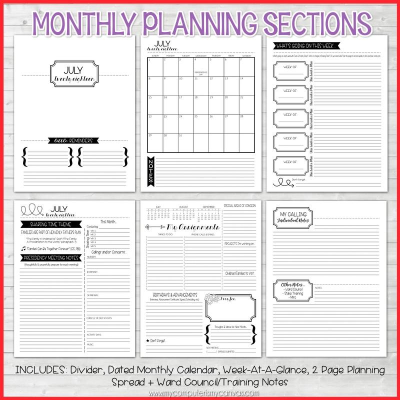 HOW TO PRINT & ASSEMBLE: Print your planner on regular white paper and choose "double sided printing". All inside pages are black and white only (which makes printing much less expense). For the covers, print one front cover for each member of the presidency (pages 1-4)... then print page 5 (the back cover) for each planner you make. The covers are designed for "borderless" printing, so if you are printing at home - select "photo printing" on your print properties and choose 8.5x11 borderless in your print properties. Most home inkjets and photo printers will perform this function (mine is 3 years old and does a fantastic job). For most vivid color results, use a heavy stock, preferably of glossy photo paper quality. I laminate my covers before binding to increase durability. Printing your covers can also be done at a copy shop. TIP: If you would like MORE "Notes" pages in your planner, simply print extra of those pages, double sided, to add to the end of the planner.