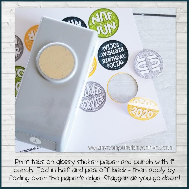 APPLYING THE STICKER TABS: This set of planner tabs is optional. For best results, print on full-size white sticker (or label) paper found at any copy/office store. Trim or punch with 1" circle then fold in half, peel the sticker back and apply tabs in a staggered fashion on the right side of the corresponding pages. Following the same application instructions... you may choose to simply print on white card stock, punch, crease/fold and adhere with a staple.