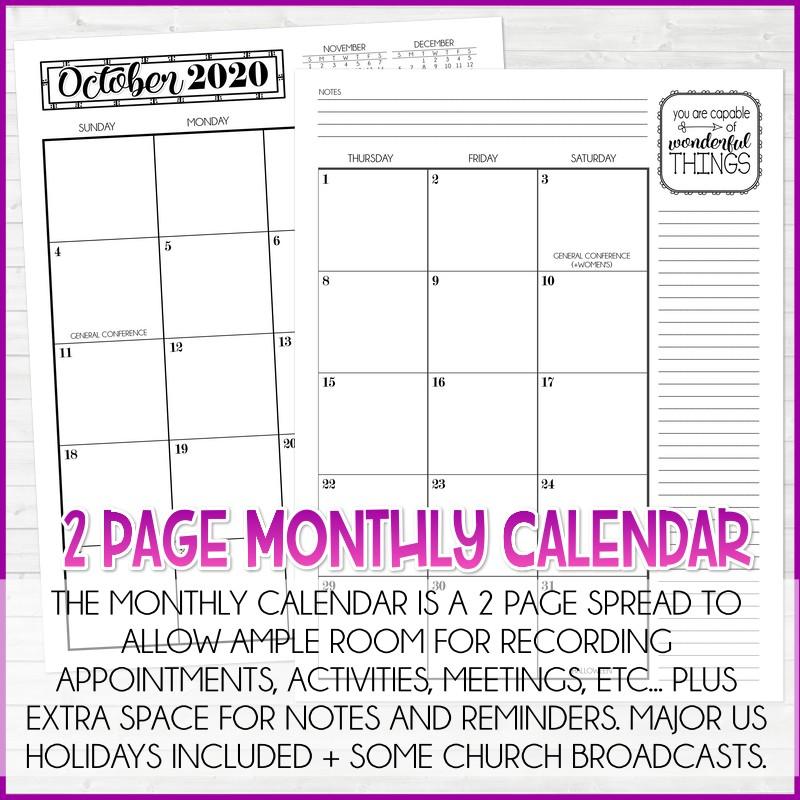 2 PAGE MONTHLY CALENDAR: The monthly calendar is a 2-page spread to allow ample room for recording appointments, special dates, activities, meetings, events, etc + there is extra space for notes and reminders. Major US holidays included + major church broadcasts.