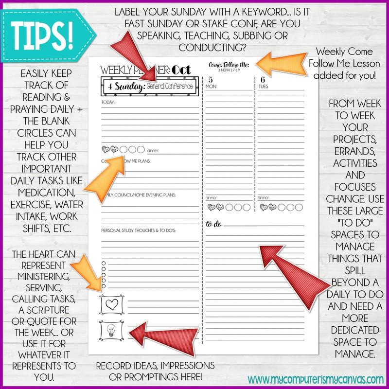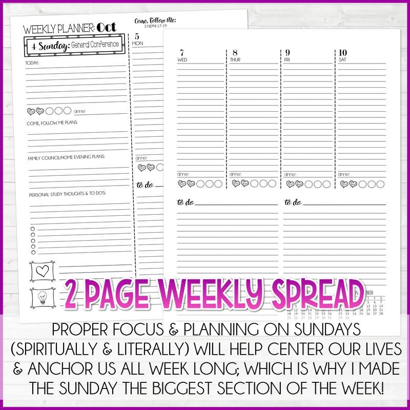This NEW unique planner layout, designed specifically with the Latter-day Saint woman in mind, allows her to manage all aspects of her busy life. It gives her daily, weekly and monthly planning space to juggle it all; including her church callings, ministering assignments and personal spiritual growth. This intuitive layout visually centers her week on the Sabbath (with space for noting Come Follow Me goals), yet has adequate space to plan the everyday happenings of her busy life. I hope you love this as much as I do!