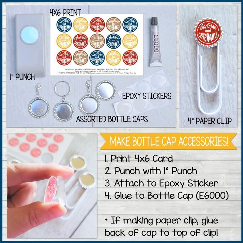HOW TO MAKE YOUR BOTTLE CAPS... Print your 4x6 at a local photo lab just like you would any 4x6 photo. Punch image with 1" round punch and apply epoxy sticker. Next, use E6000 glue to adhere to bottle cap. Supply recommendations listed below.