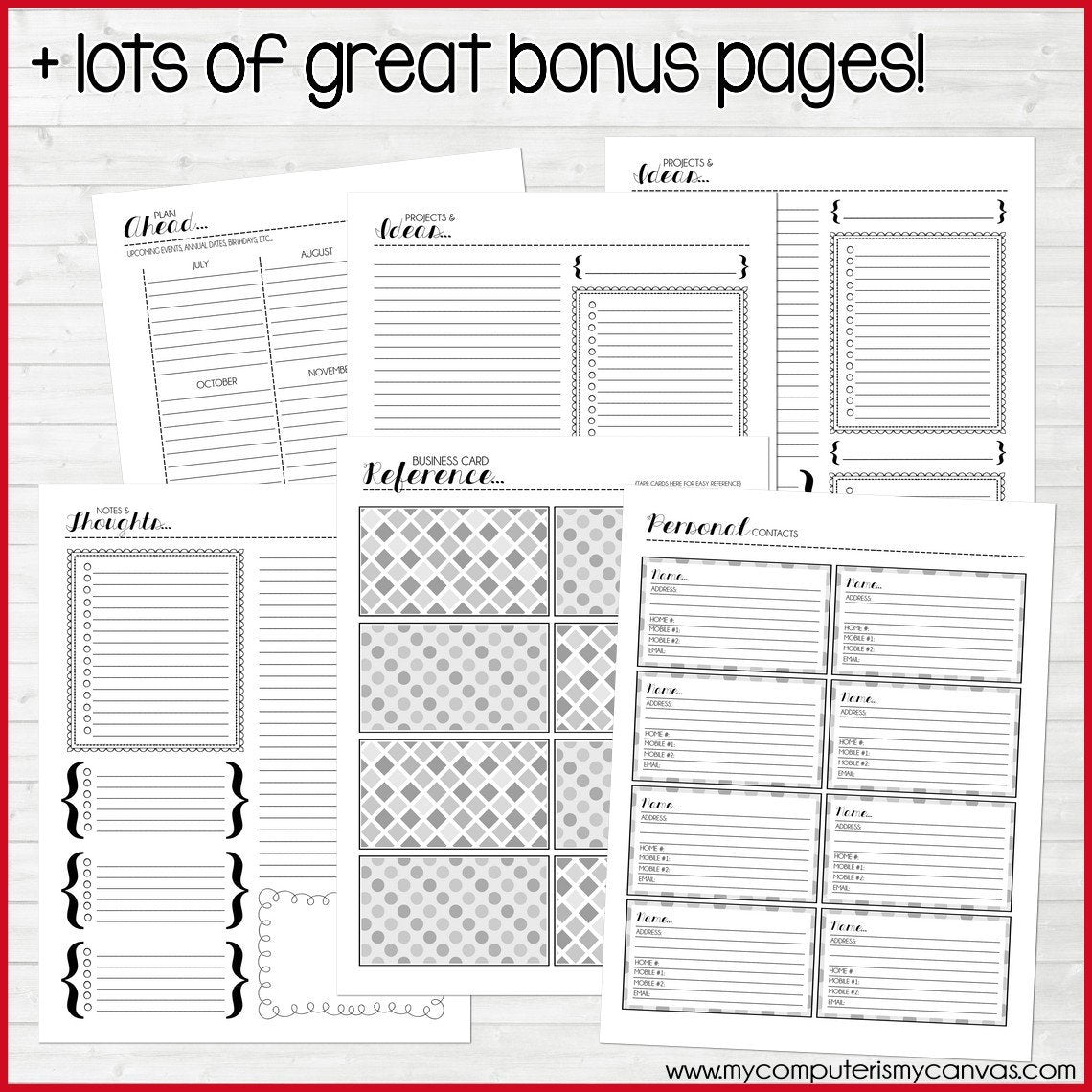 EXTRA TIP: Before printing, think through how many "extra" pages you might want (notes, contacts, etc). Do you need MORE? If so, simply print extra before binding to meet your specific needs. Same goes with the "Personal Contact" pages, 8 are included, but you can certainly print extra!