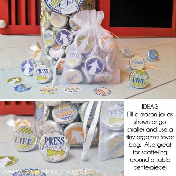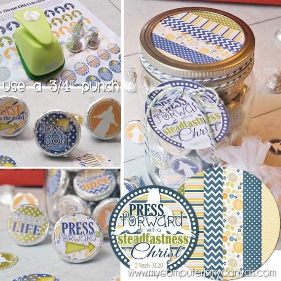 Need a creative way to introduce/reinforce the 2016 YW "Press Forward" Theme for your girls? This fun treat with the theme and key words from the 2 Nephi 31:20 scripture will make a meaningful (and sweet) handout, favor or gift! These fun 3/4" round printable stickers are perfectly sized to stick to chocolate KISS bottoms and make a DARLING gift or favor when packaged in a mason jar! This set comes complete with a printable sticker sheet, gift tags & a mason jar lid topper to finish it off! Remember... this gift tag and candy label can be used with any bag, tin or gift container - this set is not just for Mason Jars!
