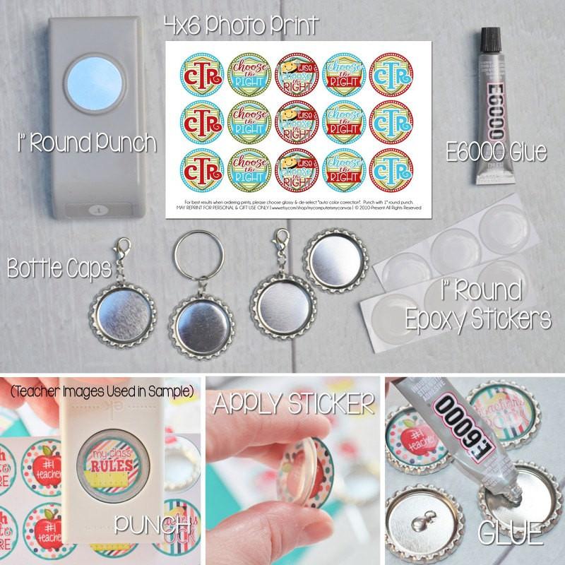 TIPS FOR ASSEMBLY: If you are using these images to create bottle cap crafts, I recommend using a 1" punch, epoxy stickers and flattened bottle caps. Bottle caps come in all kinds of varieties... plain (for making magnets) and ones with attachments like zipper pulls, key chains and necklaces! I recommend using E6000 glue (as it's specifically designed for using with metals), however the fumes are very strong - so use caution, store away from children/pets and only use with care following instructions.