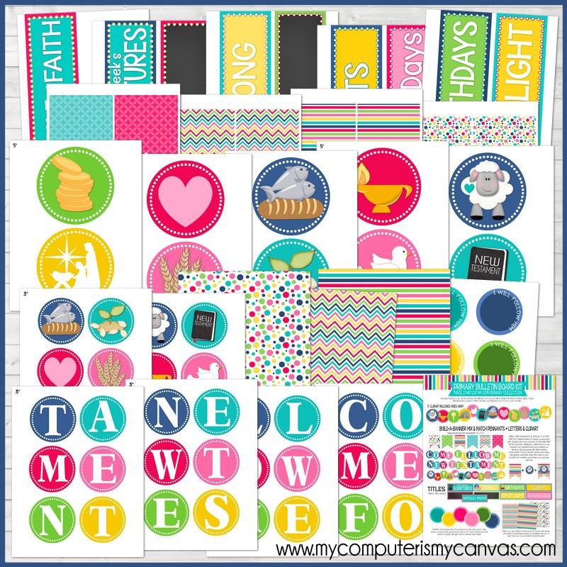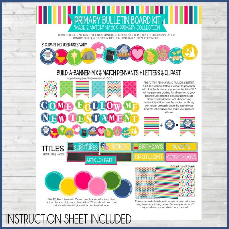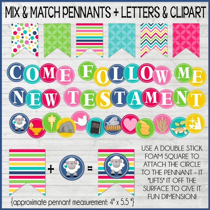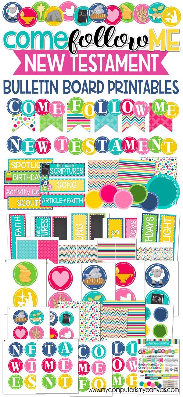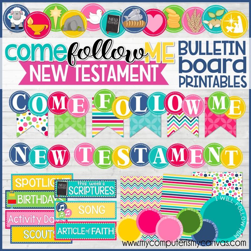This kit contains all of the titles and accents you'll need to put up a fun, bright bulletin board for the 2019 Come Follow Me, New Testament theme for Sunday School, Primary or even at home for Individuals and Families!