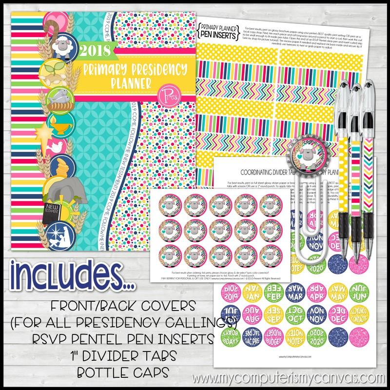 INCLUDED IN THIS LISTING: This listing includes an 96 page PDF file + a 7 page PDF with covers for each member of the Presidency + a sheet of printable sticker tabs, a matching bottle cap image and pen inserts for RSVP Pentel Pens! A MORE detailed list of what is included is mentioned below: