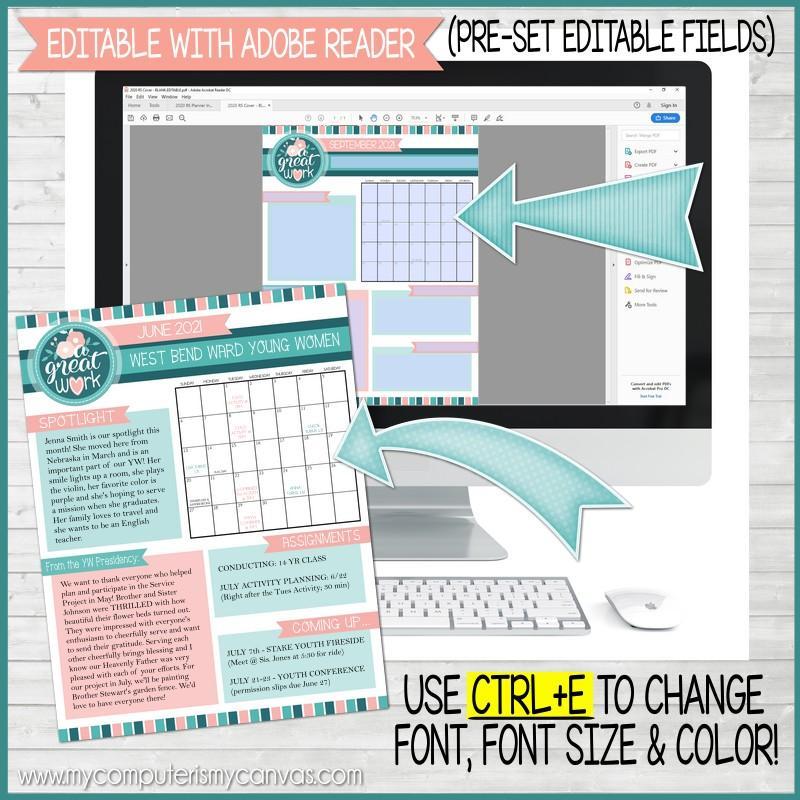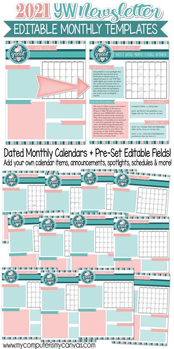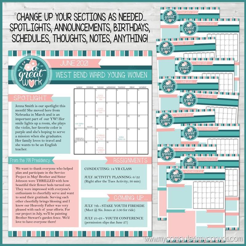Keeping your YW in the loop (especially in 2021) is a tough job! My dated, monthly newsletters can help you do it both efficiently and creatively! Simply type in your own text in the pre-set fields, save the file, then either email it to your group or print it!