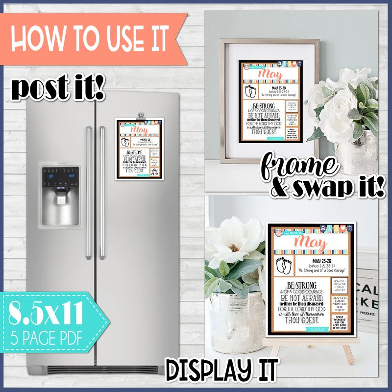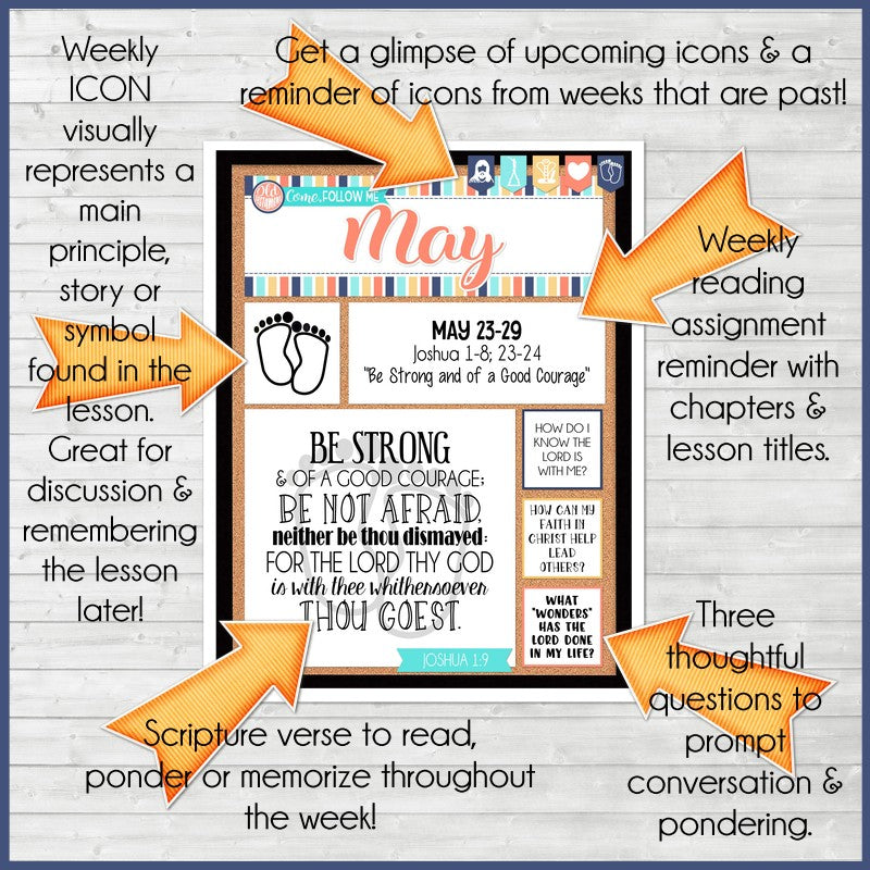 If you are looking for a fun, visual way to display and remember Come, Follow Me each week - look no further! My WEEKLY "faux" bulletin board pages are a quick, easy and informative way to keep your family on track with the reading schedule... and with a special weekly icon, a verse highlight and 3 thoughtful questions - it can also help jump start your family discussion! I call it "faux" because it's designed to LOOK like a bulletin board, but all you have to do is print and display!
