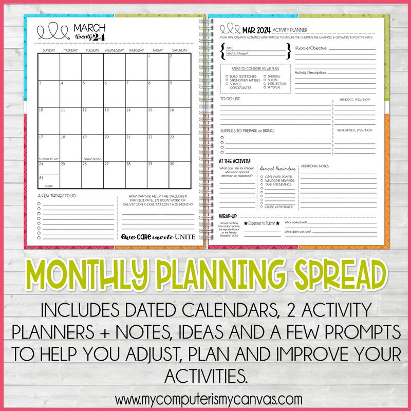 Putting together fun and purposeful Primary Activities takes lots of organization and planning! This planner is an effective, easy to use tool to help you stay organized, work as a team with your fellow leaders and to help frame your activities in meaningful and inclusive ways. With guided planning prompts, you'll find it easier than ever to fill the calendar with great activities! Some pages in this printable are editable (calendars, birthday list, roster, etc).