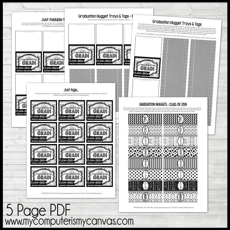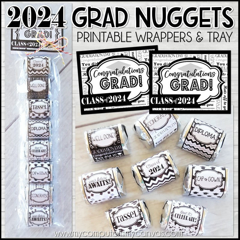 INCLUDED IN THIS LISTING: This listing includes a 5 page, high resolution PDF printable file. The first page contains assorted wrappers, perfectly sized for wrapping Hersh... brand chocolate nuggets! Simply print, trim, wrap and secure with tape. Page 2 has foldable tags and full sized printable "trays" for your nuggets to be presented in. Page 3 also has foldable tags, but comes with "mini" sized trays designed for making a smaller 4 nugget treat. Pages 4 & 5 include "just tags" without the trays in case you'd prefer to just use the tags to attached to any graduation treat! (See Image #4 for a preview of included pages.)