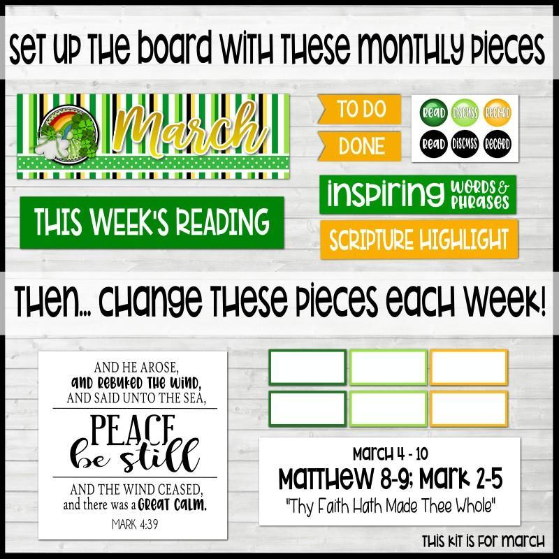 THIS LISTING INCLUDES: This listing includes a high quality 10 page PDF. The monthly and weekly pieces included are for the MARCH reading schedule (please see all images to preview pages included). After reading and studying the program, I found three simple "to do's" for each week are to read, discuss and record. Use the Bottle Cap Pins/Magnets to chart your family's progress throughout the week!