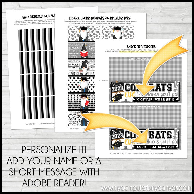 Looking for a fun, PRINTABLE gift idea for your favorite 2023 GRADUATE? Perfect for care packages, gift baskets - or just make and attach cash or a gift card! PERSONALIZE the topper with your name or your own little message (in the space provided; editable in Adobe Reader)!