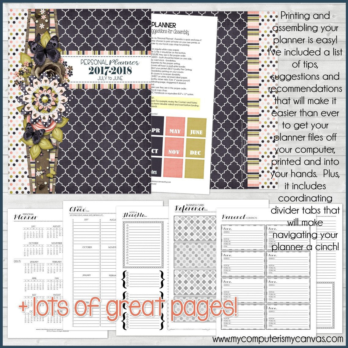 BINDING YOUR PLANNER: This planner/calendar can be printed and bound in several ways. I personally love using either the ARC or the Martha Stewart disc-bound binder system found at Staples. This planner works with Filo-Fax systems as well - OR any planner/portfolio system where you can add your own interior pages. Another great option is to have it bound by your copy store. For best results, choose "double-wire" bindings - they are MORE durable than spiral or comb. You can also choose to print double sided at home and simply put in a 3 ring binder. Important: This file is formatted for 8.5x11 printing and can fit any standard binder of this size.