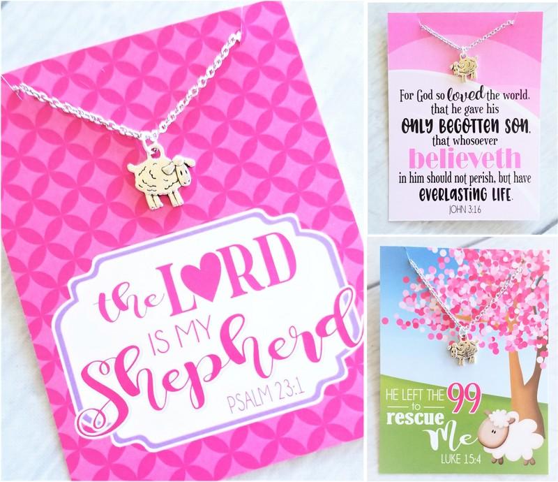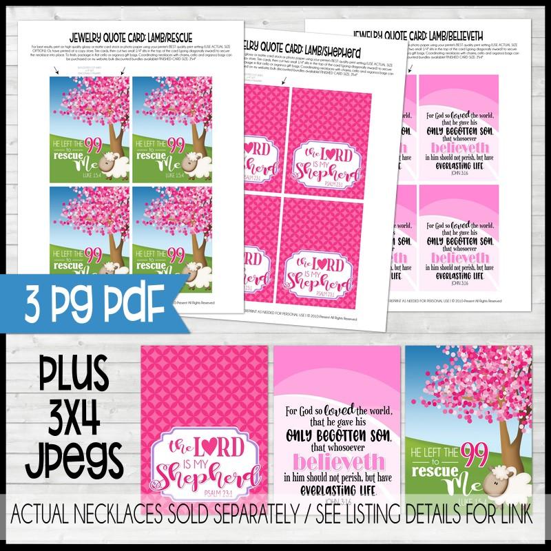 TIPS FOR PRINTING & ASSEMBLY: For best results, print on high quality glossy or matte card stock or photo paper using your printer's BEST quality print setting (USE ACTUAL SIZE OPTION). Or, have printed at a copy store. Trim cards, then cut two small 1/4" slits in the top of the card (going diagonally inward) to secure the necklace into place. To finish, package in flat cello or organza gift bags. For your convenience, Lamb necklaces, cello and organza bags can be purchased on my website as well!