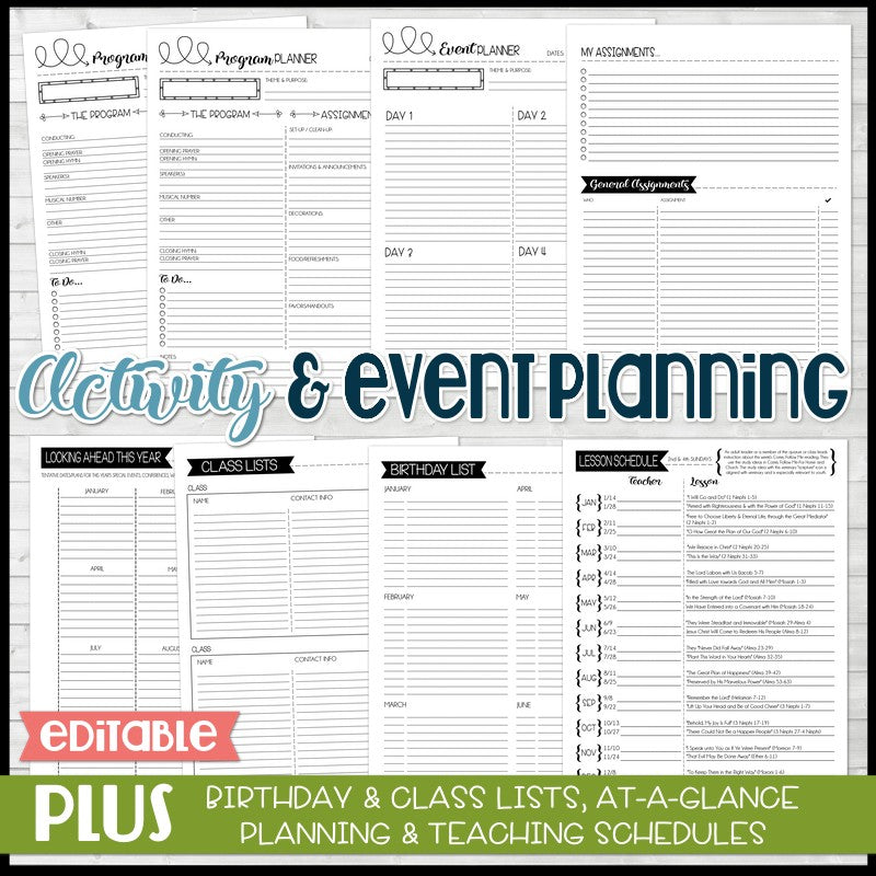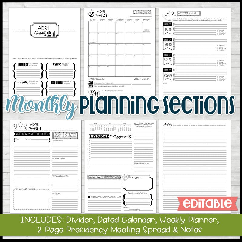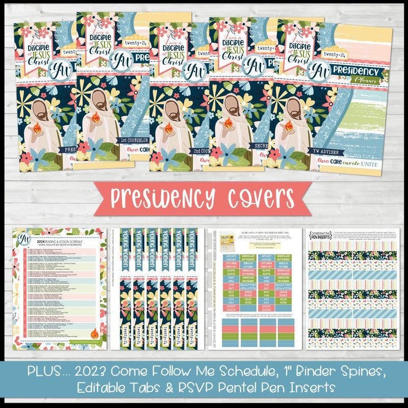 INCLUDED IN THIS LISTING: This listing includes OVER 100 planning pages and accessories - ALL EDITABLE IN ADOBE READER! Included are covers for each member of the Presidency (+ blank for adding any calling you want); a matching 2024 CFM Lesson Schedule, a sheet of printable sticker/divider tabs, and coordinating pen inserts for RSVP Pentel Pens!