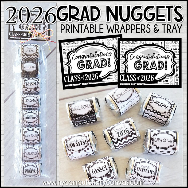 Need a unique graduation gift? This Graduation Gift Bundle includes my 2026 Subway Art, Nugget Wrappers and a collection of creative gift tags for making a basket or favors! This set is great for a bundled gift, party favors, party decor and more! Subway Art would make a great display at a graduation party, a centerpiece at a graduation dinner, a great gift for a graduate or a memento for their scrapbook! Nuggets can be sprinkled around a centerpiece - tons of ways to use this bundle!