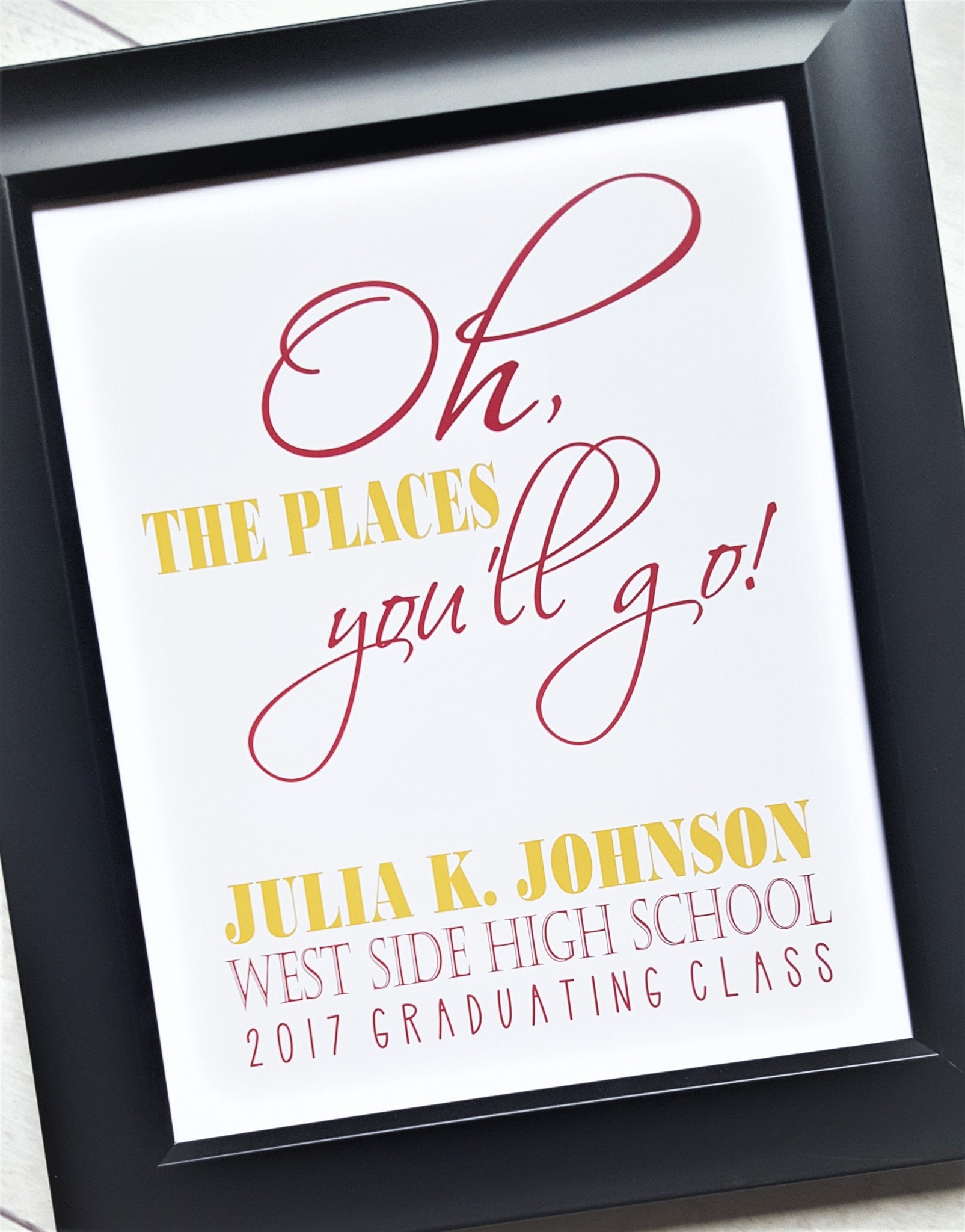 Perfect for both high school grads (as well as college)... this personalized print makes a fun and unique graduation gift! Your "Oh, the Places You'll Go!" Graduation Art would make a great display at a graduation party, a centerpiece at a graduation dinner, a great gift to a graduate or a momento for their scrapbook. This listing is for the DIGITAL ART only that will be EMAILED to you once designed - no actual, physical print will be shipped. Customer will need to upload image to a photo lab for printing, then can frame.