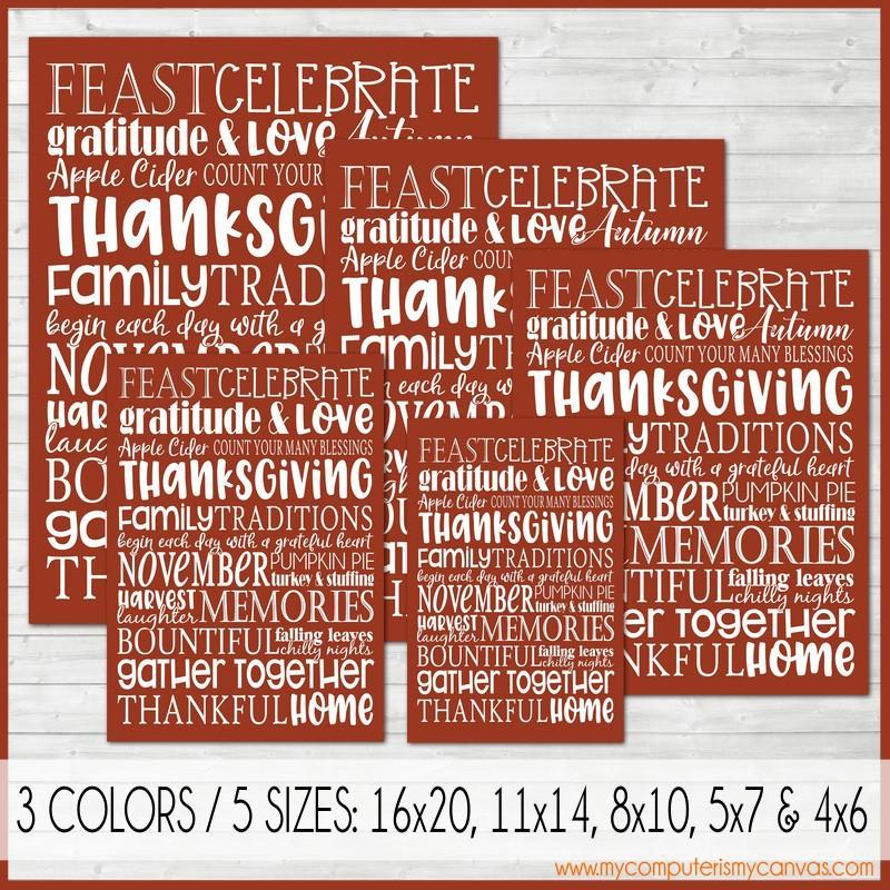 INCLUDED IN THIS LISTING: This listing includes the THANKSGIVING Subway Art images {shown above} in 3 color variations (multi-colored, white text on burgundy & white text on olive green). All color variations come in 5 standard photo sizes: 4x6, 5x7, 8x10, 11x14 & 16x20.