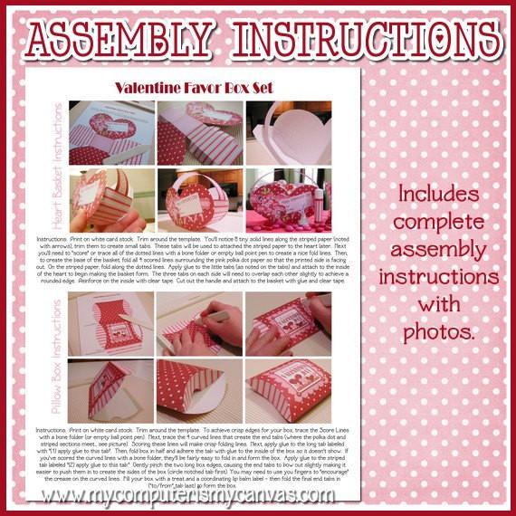 INCLUDED IN THIS LISTING: You will receive a 4 page high-quality PDF printable for printing at home or at your local copy shop. Page 1 is the template for the heart basket, page 2 is the template for the pillow box, page 3 is a full sheet of coordinating lip balm labels (with instructions) and page 4 is a full set of box assembly instructions with photos (see image #5). A bone folder is helpful when assembling your boxes, but not necessary. You will also need clear tape and a glue stick to assemble.