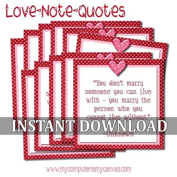 THIS LISTING INCLUDES: This listing includes a 4 page printable PDF file which includes 17 quote cards and a sheet of blank notes to use as goodie tags, lunch box love notes, or just to write a sweet message to someone you love. Simply print on white cardstock and trim. Attach chocolate kiss or chocolate heart for a sweet treat if you'd like. Hide in places for your sweetheart to find.