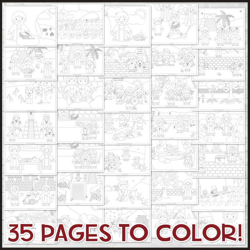 ★ Below is a list of the 35 coloring pages & "Story Summaries" included: