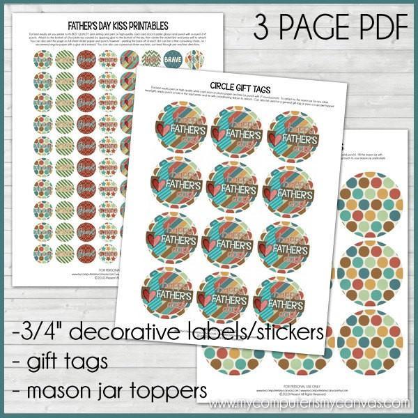 INCLUDED IN THIS LISTING: This listing includes a high-quality PDF that you can print at home or at a copy shop. Page 1 includes a variety of 3/4" round, Father's Day themed designs. Page 2 is a sheet of 2" circle gift tags and Page 3 is a sheet of Mason Jar lid toppers designed to go on the lid (but under the ring).