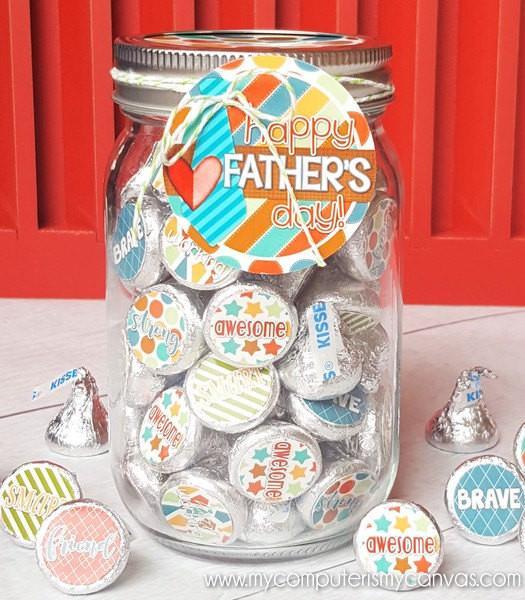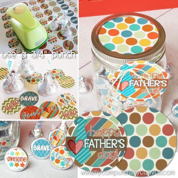 Looking for a cute Father's Day gift or treat? This fun set will make a DARLING addition to any Father's Day gift or care package! These 3/4" round printable stickers are perfectly sized to stick to chocolate KISS bottoms and make a fun gift when packaged in a mason jar, sure to bring a smile! It comes complete with a printable sticker sheet, gift tags & a Mason Jar lid topper to finish it off! Remember... this gift tag and candy label can be used with any bag, tin or gift container - this set is not just for Mason Jars!