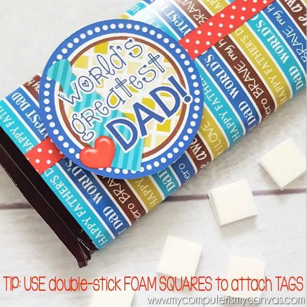 ATTACHING THE TAGS: Print the tags on the same type of paper you used for your wrapper. Then, either trim with scissors or punch with a round craft punch. To attach to the bar, I recommend using double-stick foam squares (available at craft and office supply shops). This sets the tag apart from the wrapper, giving it dimension and adding an extra bit of uniqueness over a regular wrapper!