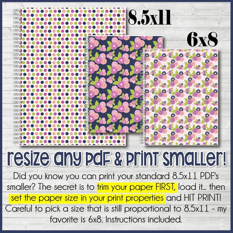 RESIZE YOUR PDF & PRINT SMALLER JOURNALS & PLANNERS! The simplest way I've found to "shrink" a standard PDF is to FIRST determine a smaller size that you like AND that is closely proportional to 8.5x11. Next, trim your paper to that size BEFORE PRINTING (this is the KEY)! Load it into your printer and when you hit "print" - in the Print Properties box that opens, change your paper size to match the size you want (the size you trimmed your paper). If the paper size you want isn't listed as a size option, you can go into your Control Panel/Printers and in Print Properties add a custom paper size. My favorite "smaller" size is 6x8! For a step by step tutorial, check the Color Pack listing details for a link. This can also be done by a copy shop clerk. (TUTORIAL HERE)