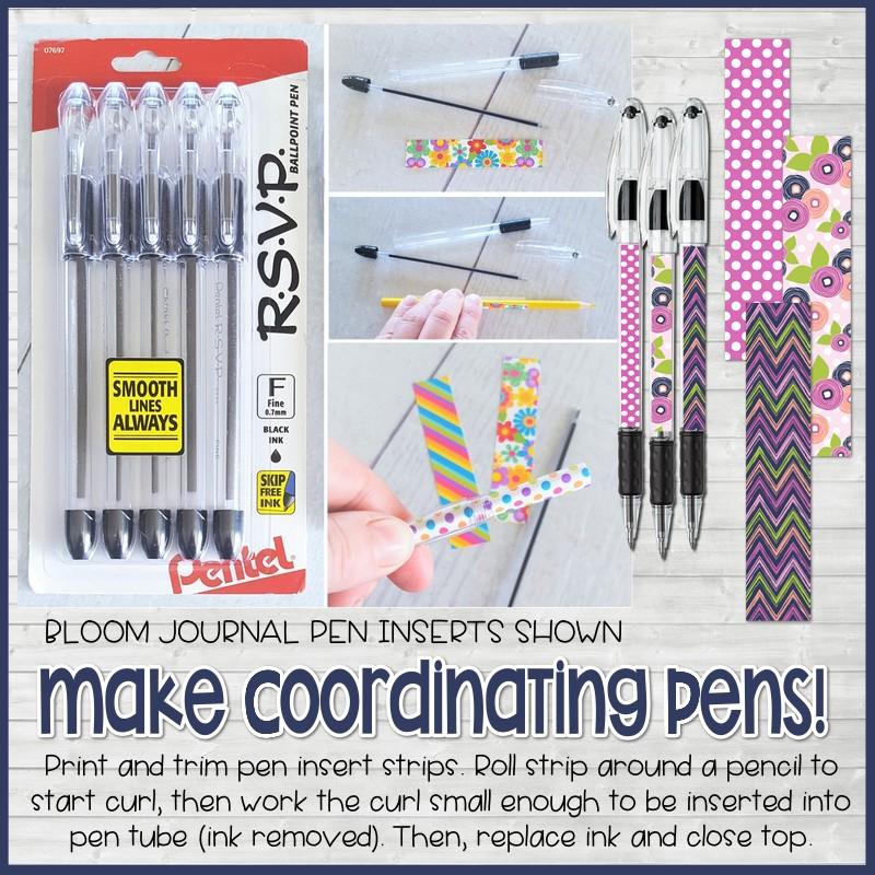 PEN INSERTS (RSVP PENTEL PENS): For best results, print on glossy brochure paper using your printer's BEST quality print setting OR print at a local copy shop. Next, trim each piece and roll long-ways around a pencil to start a curl, then work the curl to be small enough to fit inside pen tube. Open the end of an RSVP Pentel clear pen and insert curled strip (see my shop for picture tutorial). Trim excess paper if needed and replace ink back inside and secure tip. If needed, use tweezers to twist or grab paper to adjust.