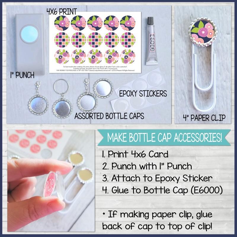 BOTTLE CAP IMAGES: Print your 4x6 at a local photo lab just like you would any 4x6 photo (but de-select the "auto color correction" option if it is checked for you). OR, print at home on photo paper (just remember to set your paper size to 4x6). Punch image with 1" round punch and apply epoxy sticker. Next, following the instructions on the tube, use E6000 glue to adhere to bottle cap. My favorite way to use bottle caps with my planners is to adhere it to a 4" paper clip (using the E6000 again).