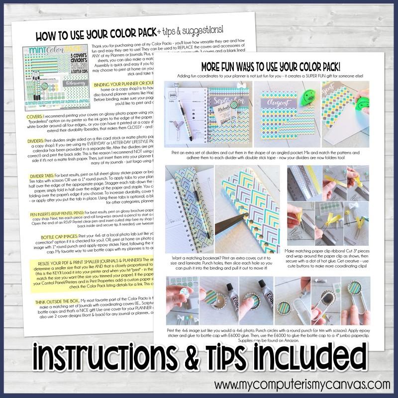 THINK OUTSIDE THE BOX... My most favorite part of the Color Packs is the versatility! Just think... with 3 covers in each pack, you could make a matching set of Journals with coordinating covers (IE... Scripture, Sabbath & General Conf)! Add a set of tabs, pens and bottle caps and that's a NICE gift! Use one cover for your PLANNER and make a MATCHING NOTEBOOK to go with it! You can also use 2 cover designs (front & back) for any journal or planner... or use two different ones together! Etc, etc... so many options!